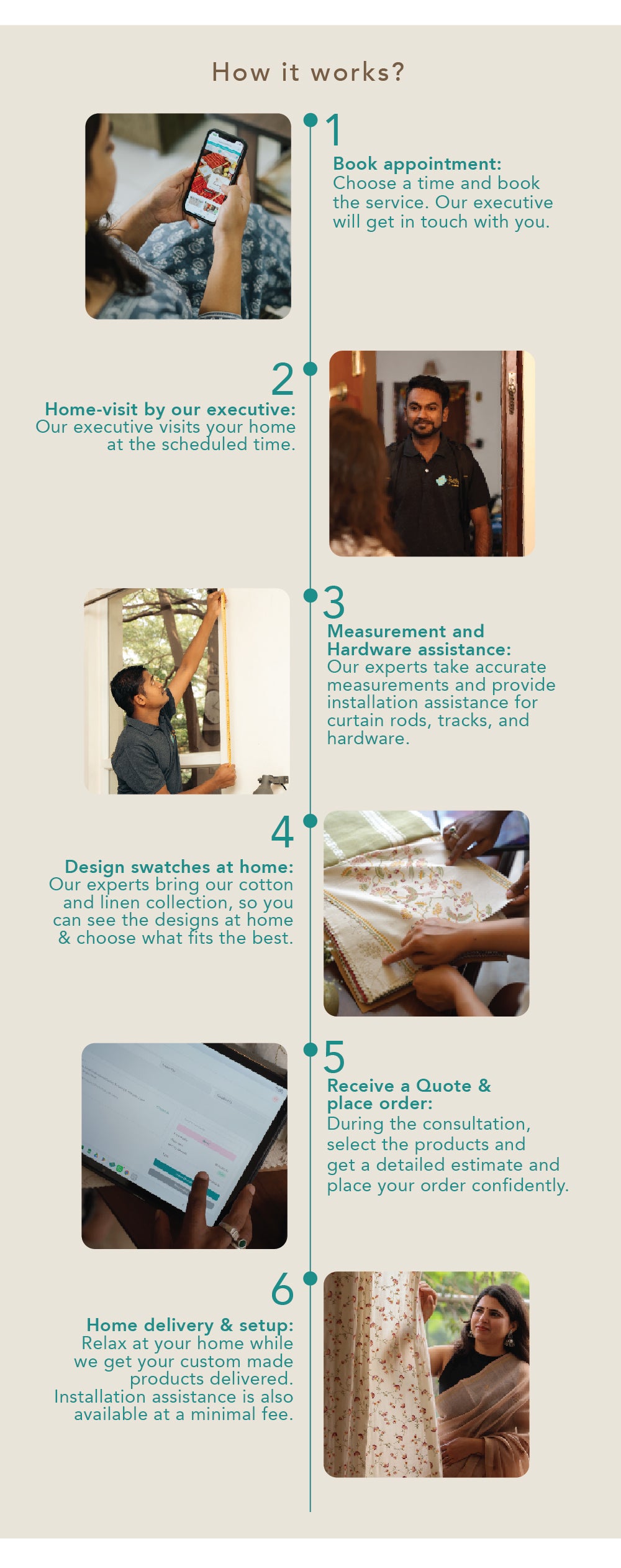 We provide free home consultation in Bangalore to help homeowners select the perfect furnishings for their interiors. Our experts visit your home to take accurate measurements, present fabric samples, and provide styling recommendations tailored to your space. Once finalized, our team handles stitching, finishing, and professional installation to ensure a seamless experience.
